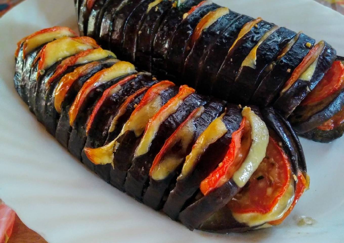 - Colocar en cada ranura de la berenjena una rodajitas de tomate con un pedacito de queso en feta. Luego en un molde de pan colocar la berenjena y hornear a 200° por unos 30-40 minutos depende de cada horno. Servir caliente o frío.