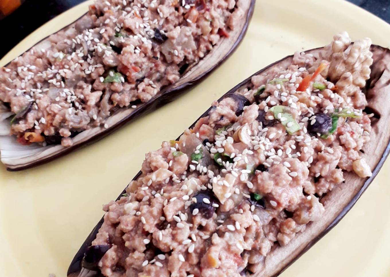 Berenjena rellena con soja texturizada, tomates secos y nueces