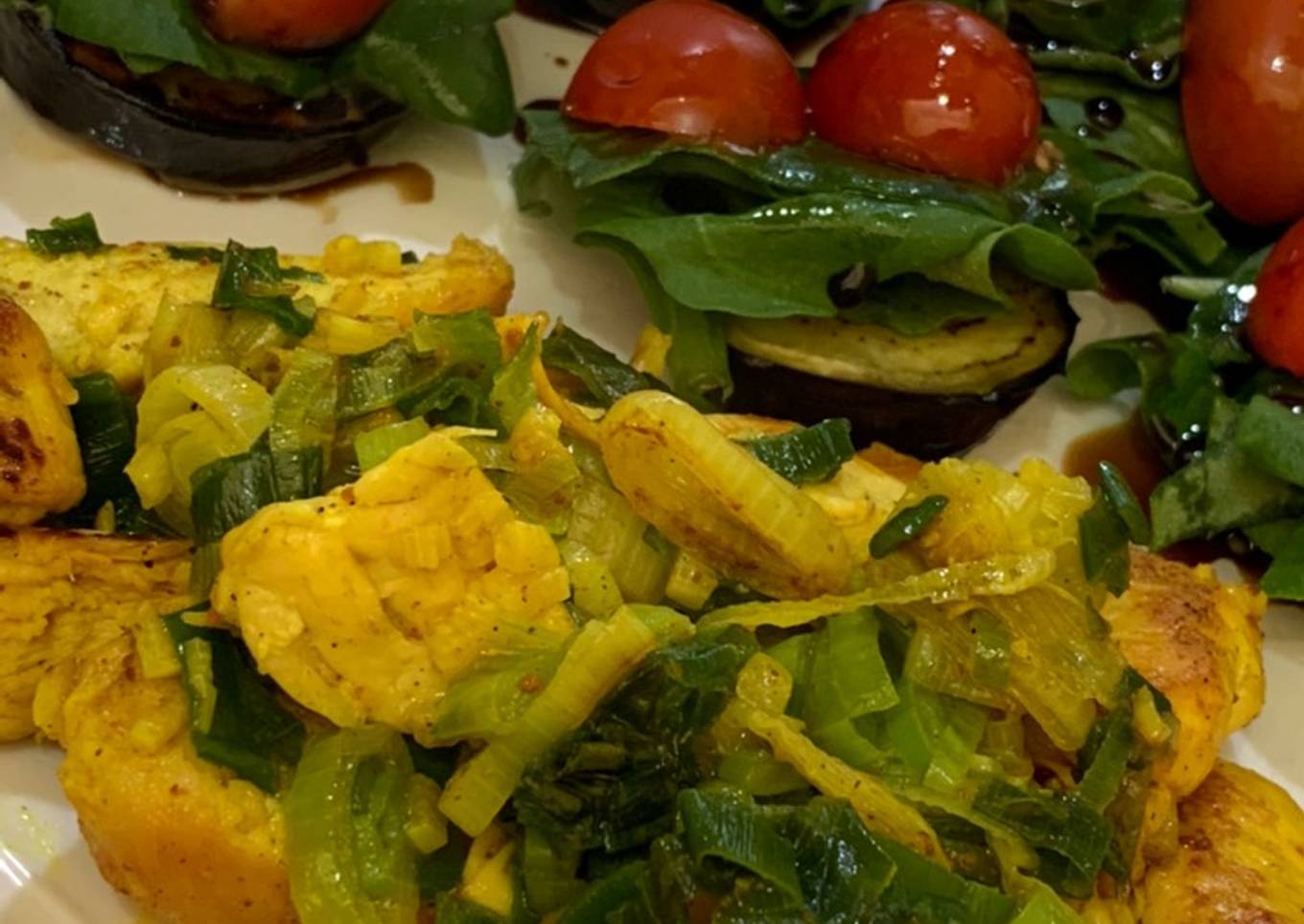 - En una planchita colocamos una cucharadita de aceite de coco, el diente de ajo picadura chico, media cucharadita de cúrcuma y un poco de pimienta y cocinamos el pollo en trozos. Cuando casi esté listo incorporamos un poco de cebollita de verdeo