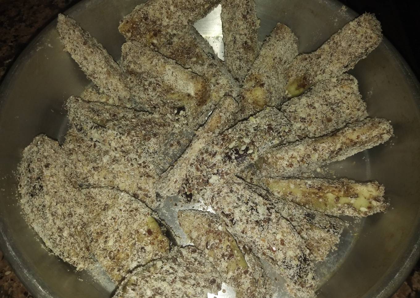 - Comenzamos mezclandos las harinas que formaran nuestro reemplazo de pan rallado. Mezclar harina de coco, harina de lino, semillas de Sésamo, condimentos. Aparte battir 1 huevos y salpimentar. Cortamos las berenjenas en cuñas. Las pasamos por huevos y ñuego por el mix de harinas.