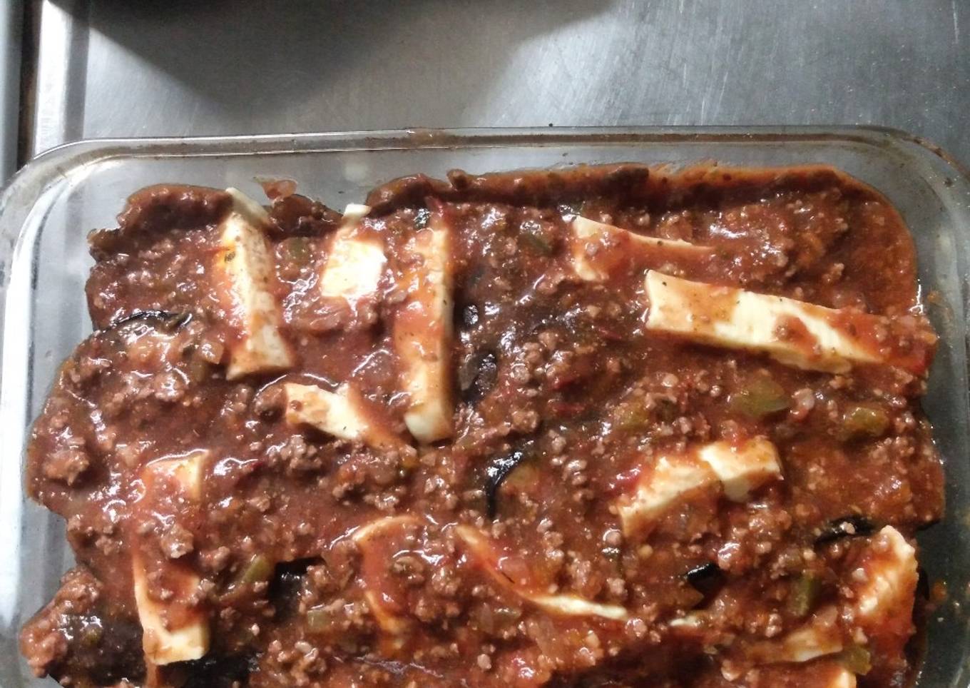 - Poner una capa de berenjenas. Condimentar. Agregarle tiras de queso, una capa de salsa (yo usé bolognesa que me sobró de los fideos caseros), repetir hasta terminar con una capa de salsa. Espolvorear con queso rallado o pedacitos de queso