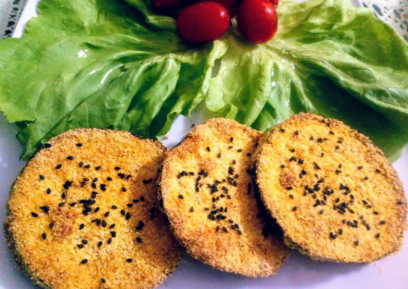 - Precalentar el horno, aceitar una fuente colocar las berenjenas cocinar a horno medio aproximadamente 20 minutos (depende del grosor)hasta que se doren ambos lados quedan crujientes por fuera si les gustan se pueden freír, yo lo acompañé con lechuga y tomates cherrys espolvoreado con semillas de sésamo, por arriba de las milanesas de berenjenas (pueden agregar mix de semillas en la harina de maíz) también pueden una rodaja de tomate y queso...