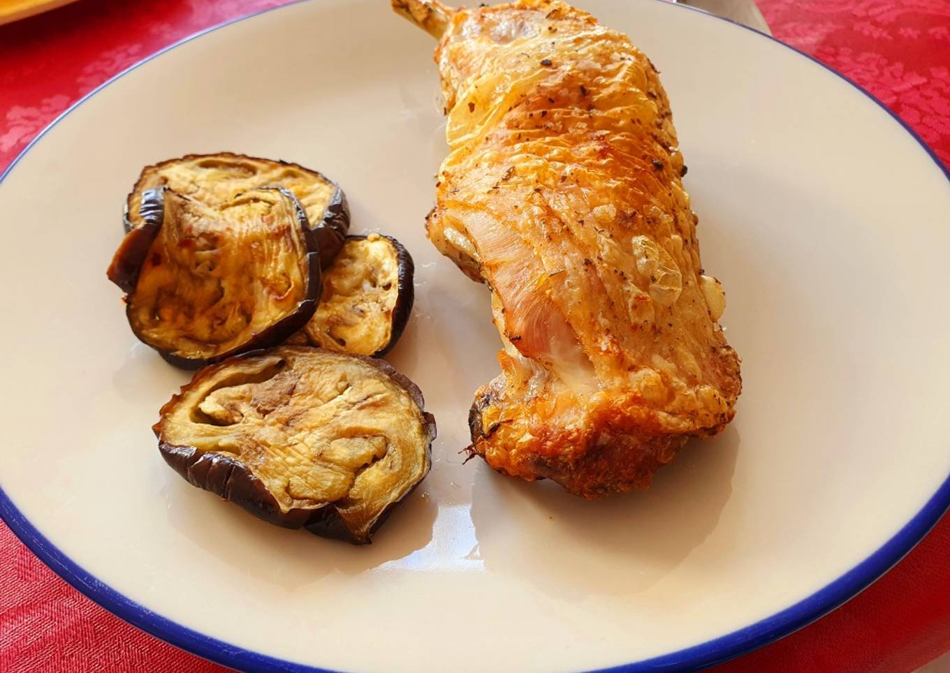 Este año los reyes me regalaron una freidora de aire y ¡Me encanta! Hacía tiempo que me llamaba la atención este aparato y ahora puedo experimentar con el!! Algún experimento esta semana me salió regularín - como por ejemplo pescadito de bahía (que la próxima vez intentaré sin rebozar en harina a ver qué tal) y la berenjena que está en la foto que estaba solo aprobable y tendré que que hacer alguna variación para que la próxima me salga mejor. Pero el resultado de otros experimentos me han sorprendido por la sencillez y la rapidez y también el resultado final. Este es un ejemplo, pollo frito que salió muy sabroso, suculento y sin duda lo volveré a hacer. Froté los contramuslos con las hierbas y especias (puedes usar las que más te gusten) la noche antes y los guardé en la nevera, pero se puede hacer en el momento sin problema.