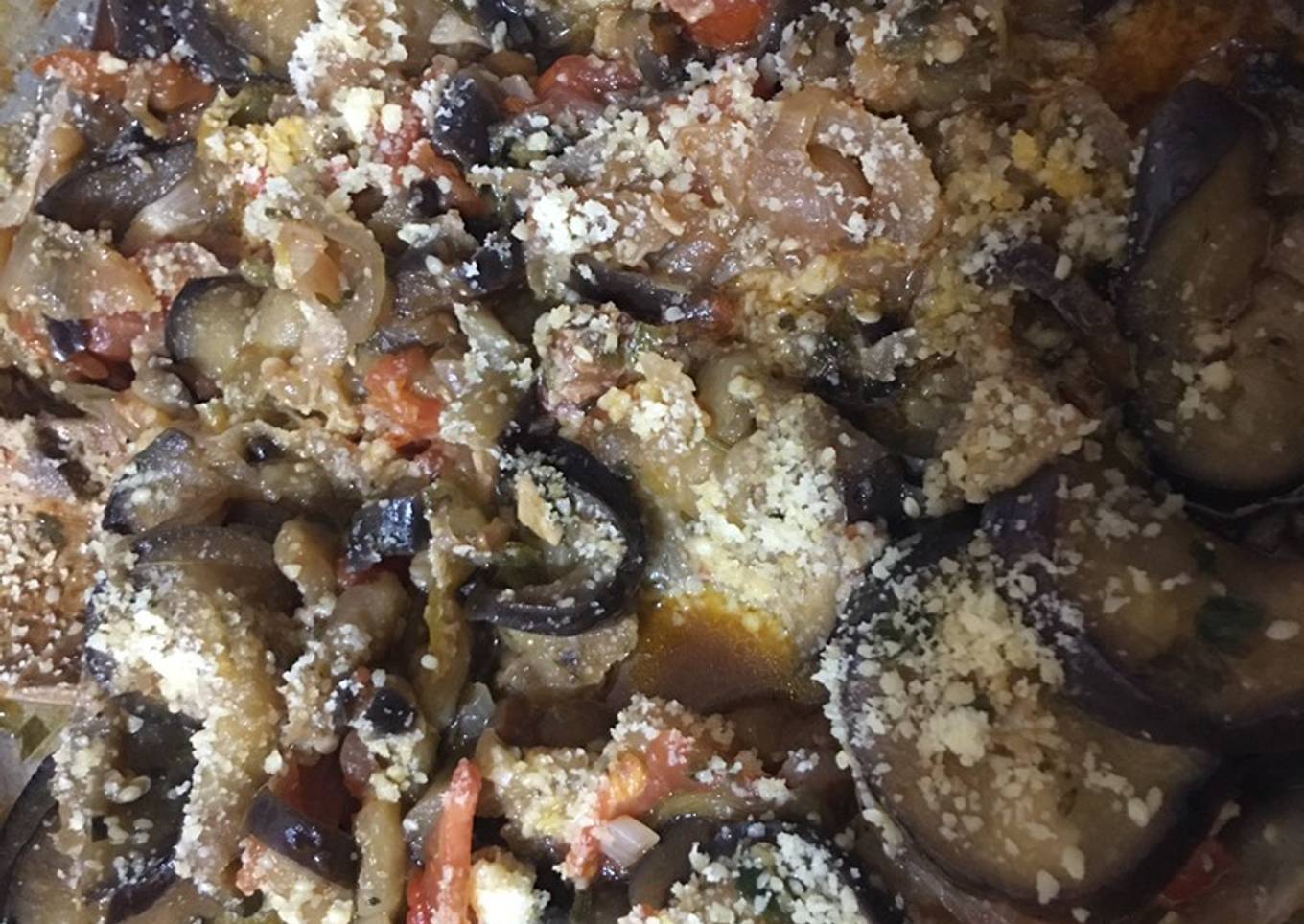 - Ponemos a rehogar cebolla ajo perejil pimientos. Agregar las berenjenas, cuando están medio cocinadas el tomate en rodajas y si hace falta un poquito de agua