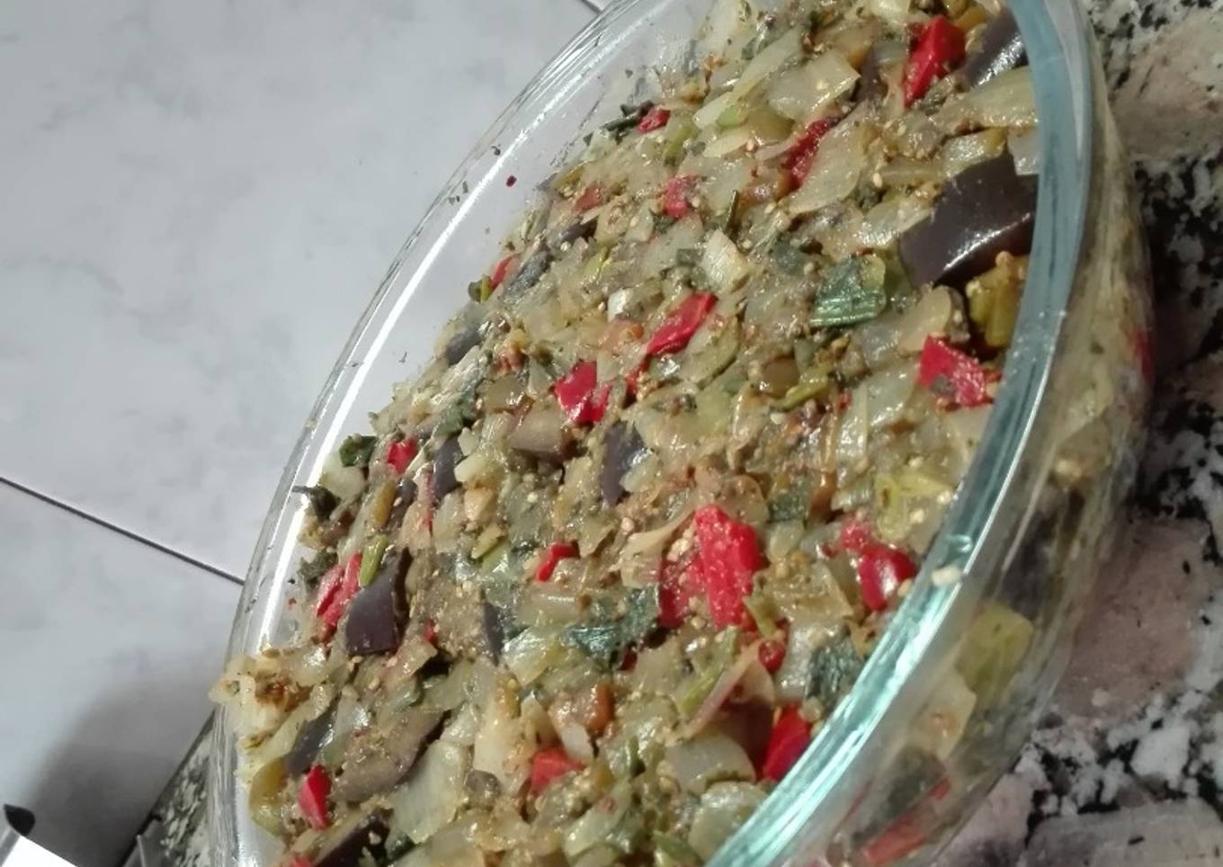 - Cortar las berenjenas en cubos y ponerlas en la sartén con un poquito de aceite junto con los de más ingredientes cortados bien chiquitos.