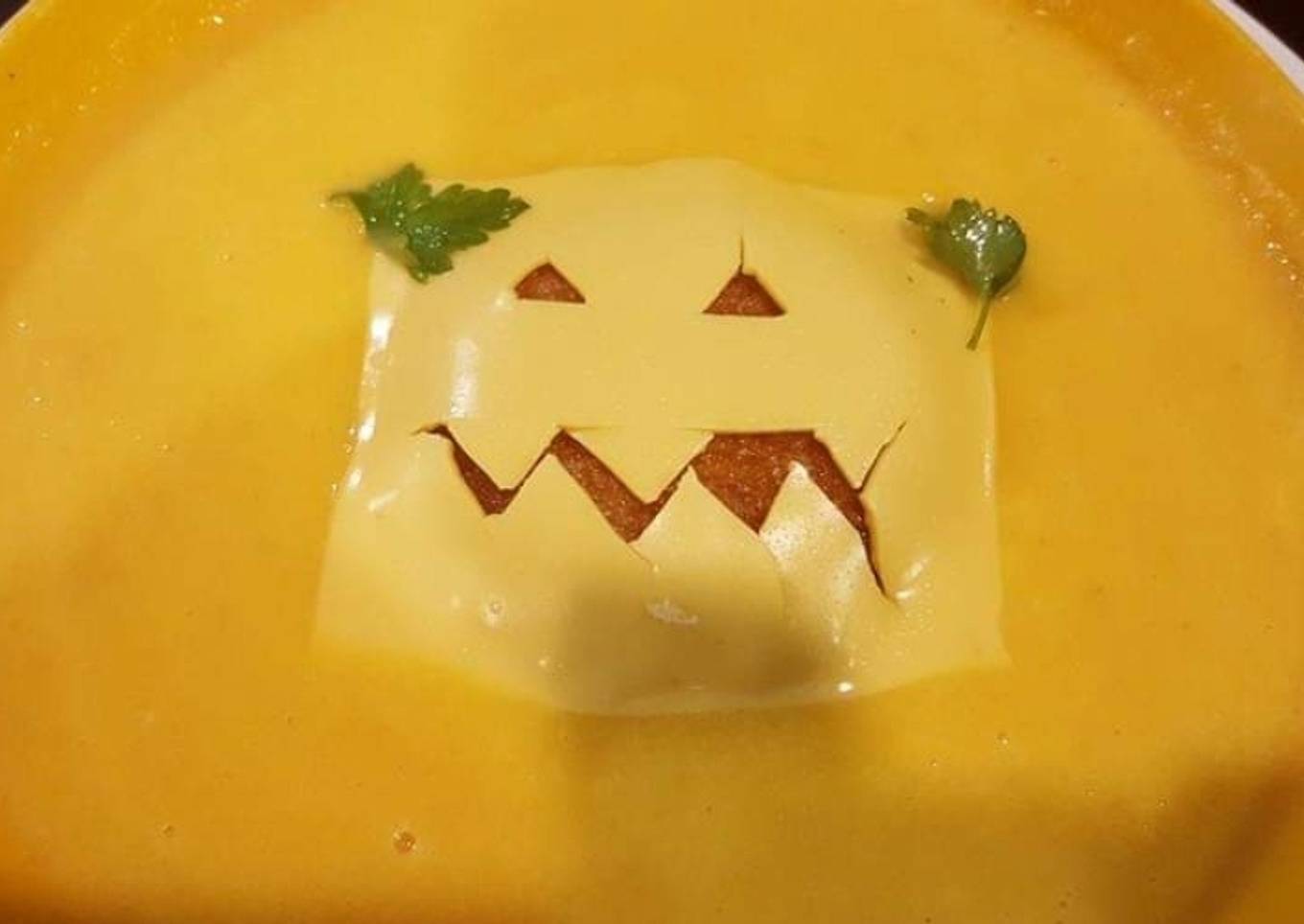 Crema de calabaza con monstruo de pan frito y cheddar π