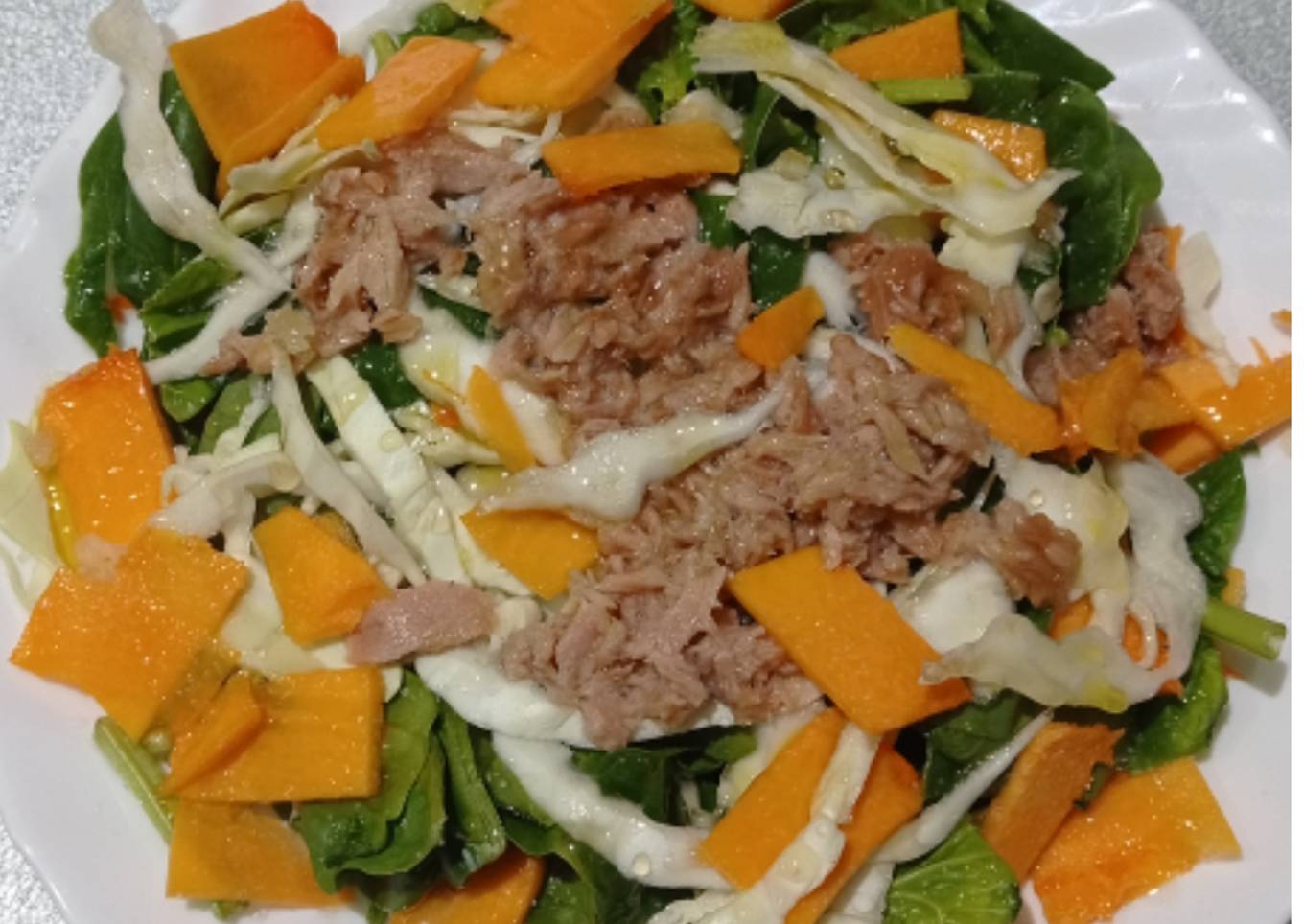 - Cuando tengamos todo troceado echar el bonito y aderezar con miel, sal, vinagre y aceite