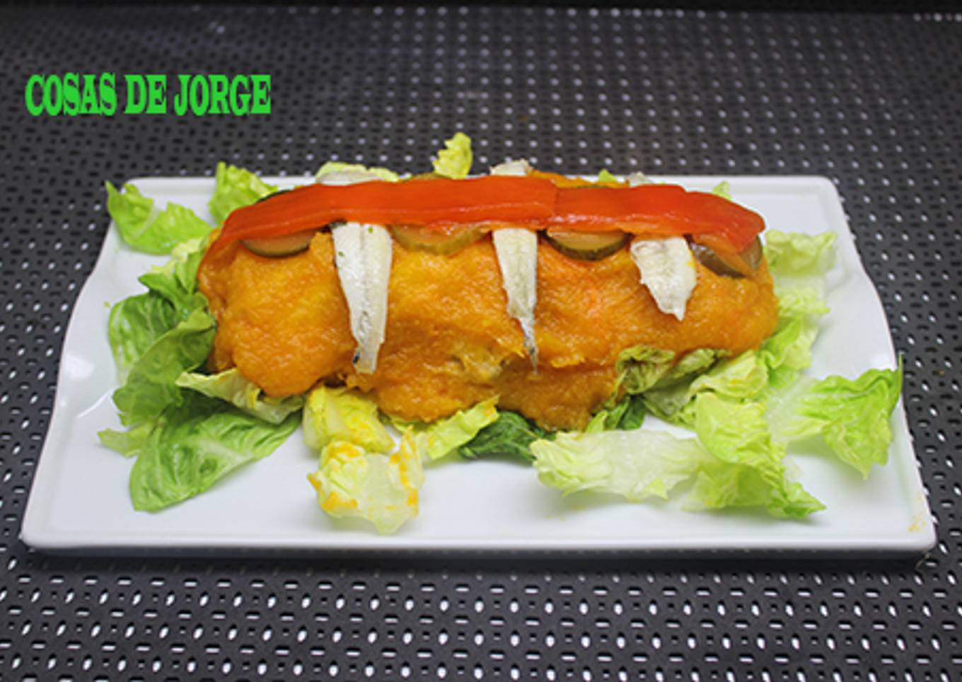 - Decoramos con los lomos de boquerones en vinagre, rodajas de pepinillo y los pimientos rojos de lata.